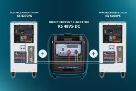 The K&S Tandem System, combining a DC generator ( KS 24VS-DC, KS 24VM-DC or KS 24VGS-DC) with the portable power station KS3000PS or DC generator ( KS 48V-DC, KS 48VS-DC, KS 48VGS-DC) with the portable power station KS5200PS, delivers a fully automated, fuel-efficient, and silent energy supply for homes, small businesses, telecom sites, and mobile applications. The DC generator starts only when the battery is discharged, keeping operation quiet and the air clean while maximizing the use of stored energy. No idle running - no wasted fuel.