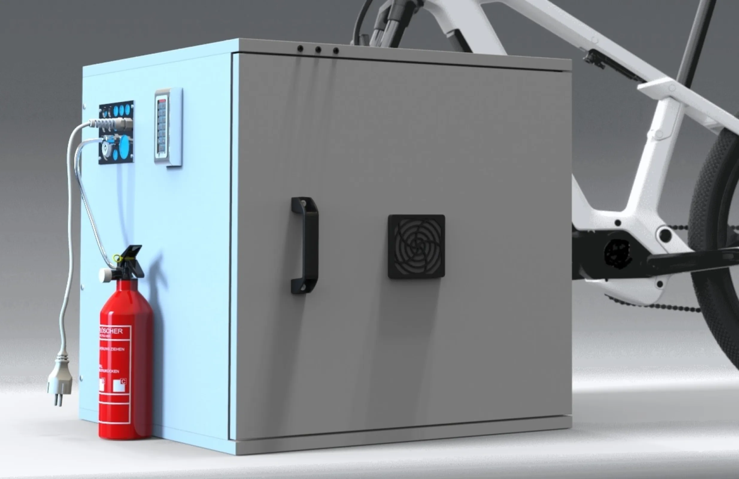 The QUBE© system is a safety enclosure for charging and storing accumulators and batteries that uses an integrated cooling system to reduce the occurrence of critical gases in the event of a battery fire or thermal runaway. This leads to the opportunity to install the enclosure in hallways, entrances and residential buildings without the need for venting to the outside.