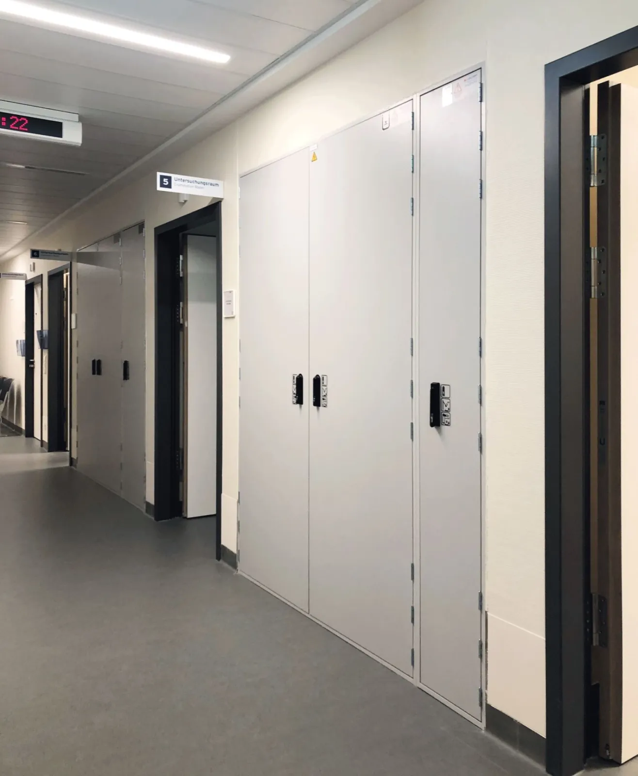 This system is a door for the protection of necessary escape and rescue routes that is mainly used in hospitals, high-rise buildings or office complexes, in order to separate electrical installations or cable systems behind it. The all-round seal of the doors protects against the spread of fire and smoke, allowing the safe use of escape and rescue routes, for example in hospitals for the evacuation of intensive care patients.